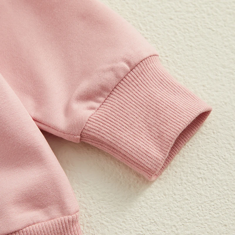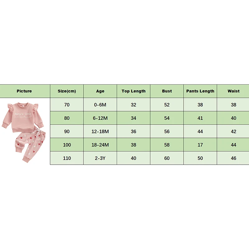 طقم بنات لطيف ومميز لفصل الربيع والخريف، مكون من سويت شيرت طويل الأكمام بياقة دائرية وفوقه طبعة حروف أنيقة مع كشكشة، وبنطلون مطاطي مع طبعة قلوب لراحة وأناقة طفلتك. مثالي للارتداء اليومي، التصوير، اللعب في الخارج، المناسبات والرحلات.